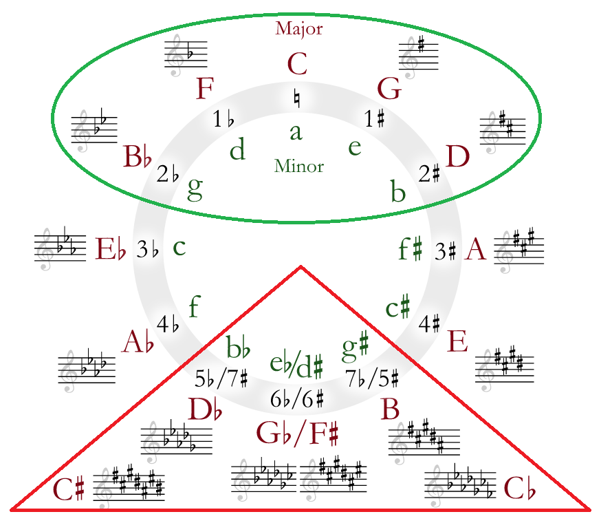 The notes in each key are listed (though spelled incorrectly with all flats shown as their enharmonic sharps).